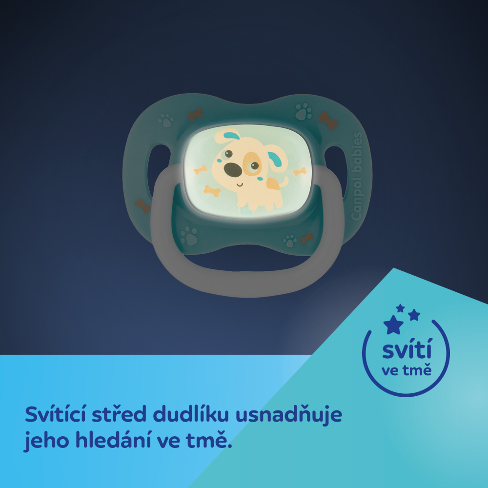Silikonový dudlík s špičkou symetrického tvaru s potiskem BUNNY & COMPANY. Obsahuje úchyt svítící ve tmě. Dudlík neobsahuje BPA. V balení 1 kus.