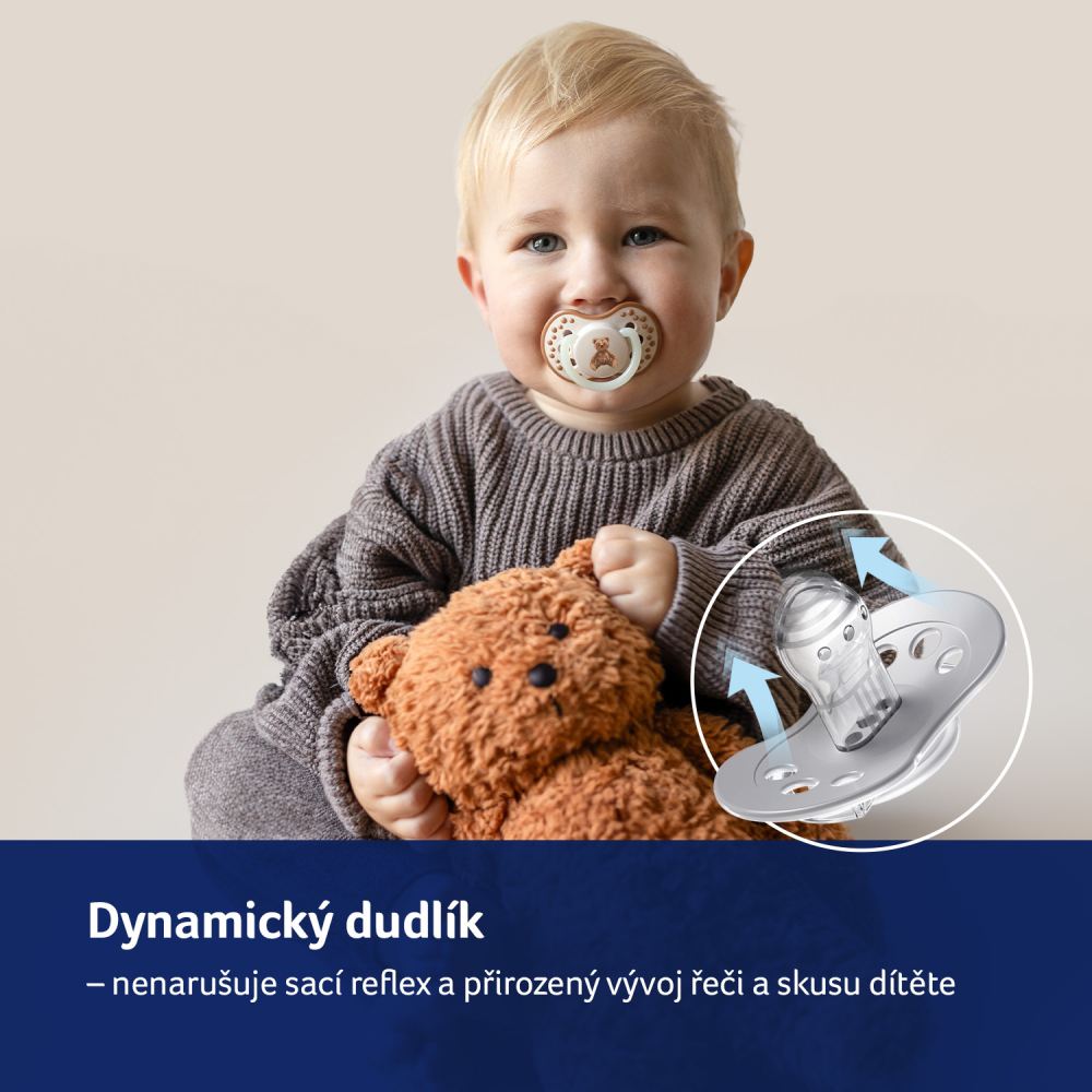 Dynamický dudlík LOVI z nové kolekce TEDDY LOVE podporuje sací reflex, nenarušuje vývoj řeči ani skusu a díky unikátní silikonové konstrukci je šetrný ke kojení.