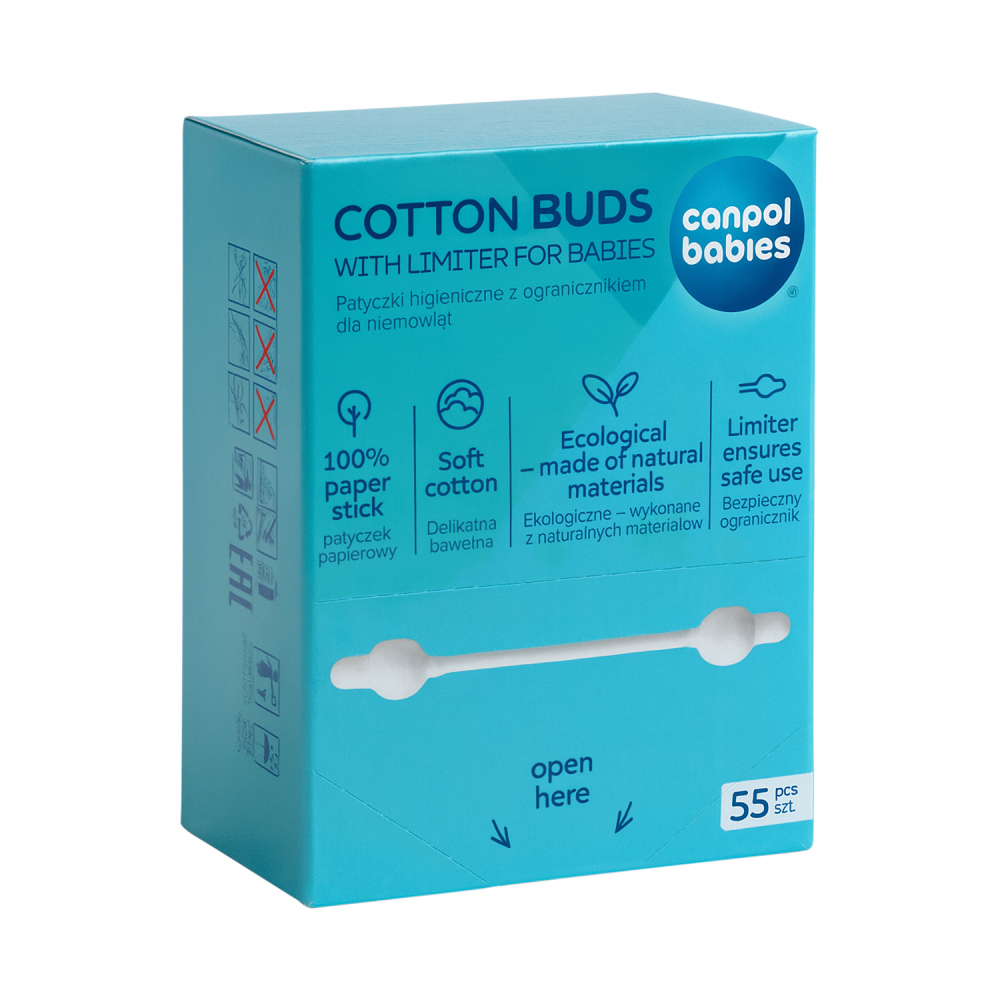 A többfunkciós fültisztító pálcikák finom pamutból és papírból készülnek. A pamutrudacska pamut részének formája korlátozóval biztosítja a nyugodt használatot. A papírpálca a műanyag pálcikák ökológiai alternatívája. Alkalmasak a nehezen hozzáférhető helyek, sebek és horzsolások kezelésére. Nélkülözhetetlenek a mindennapi babaápolásban. A csomag 56 darabot tartalmaz.