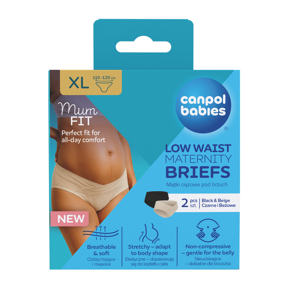 Kényelmes kismama bugyi puha pamutból, bézs és fekete színben, rugalmas derékrésszel és a pocak alatti íves alacsony derekú kialakítással, amely maximális kényelmet biztosít a terhesség ideje alatt.