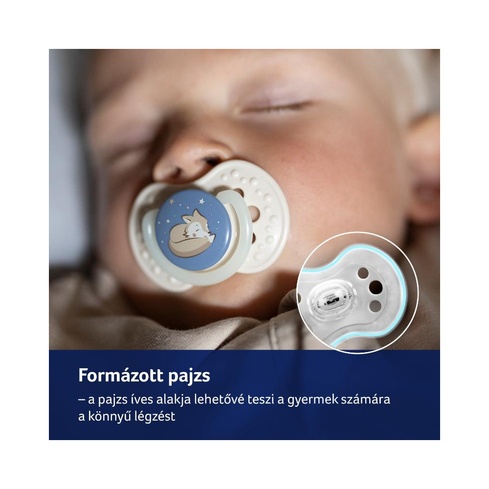 A formázott pajzs lehetővé teszi a gyermek számára az orron keresztüli légzést; biztonságos anyag, amely nem tartalmaz biszfenol A-t.