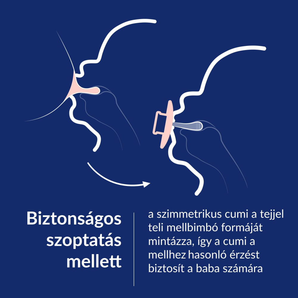 Különféle vastagságú szilikonból készült egyedi szerkezetének köszönhetően a dinamikus cumi a baba szopási ritmusának megfelelően nyúlik meg és húzódik össze. Védi a szopóreflexét, és nem befolyásolja hátrányosan a szoptatást. A végződés szimmetrikus formája a tejjel telt mellbimbó alakján alapul, ami a baba számára a mellhez hasonló, ismerős érzést nyújt.