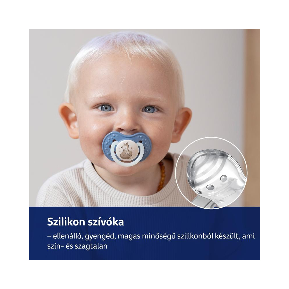 Heterogén szilikonból készült, amely lehetővé teszi a cumi összehúzódását és megnyúlását a gyermek szívásával összhangban; a cumi szimmetrikus alakja imitálja a mellbimbót