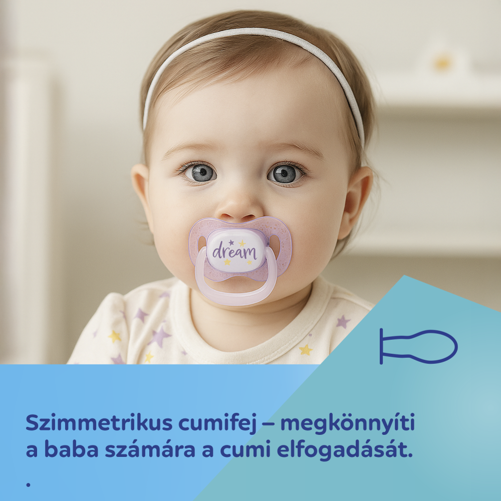 A szimmetrikus végződés megkönnyíti a baba számára a cumi elfogadását.