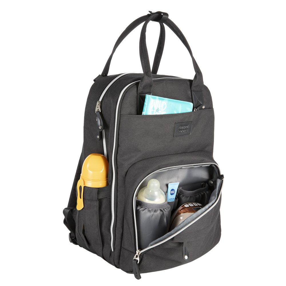 A hátizsák multifunkciós, praktikus zsebekkel és pelenkázó alátéttel rendelkezik – így ideális sétákhoz és utazáshoz.