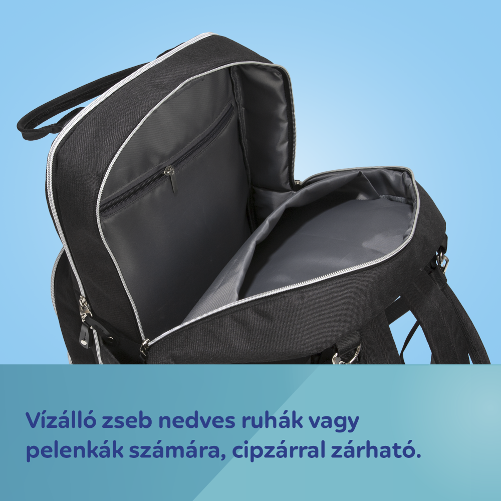 Vízálló zseb nedves ruhák vagy pelenkák számára, cipzárral zárható. Termozsebek, amelyek hosszabb ideig ideális hőmérsékleten tartják az ételt és az italokat.