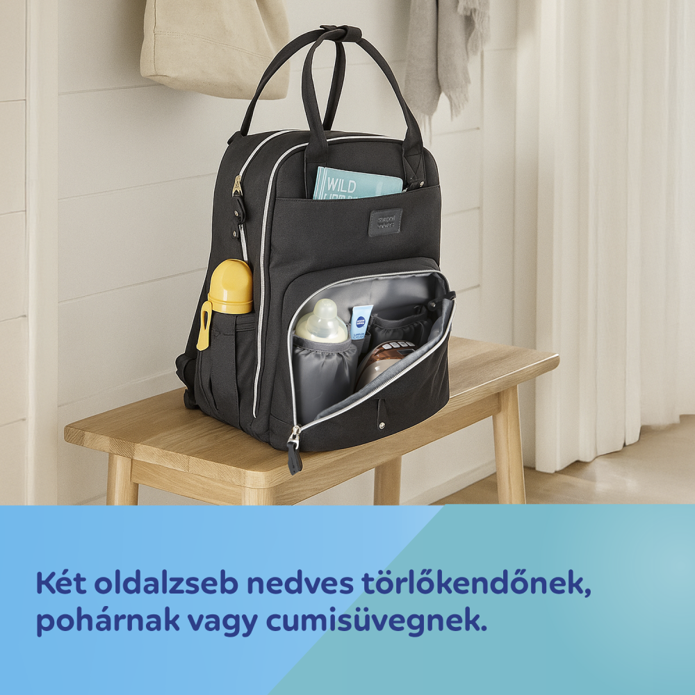 Két praktikus oldalzseb: az egyik nedves törlőkendőnek nyílással, a másik itatópohárnak vagy cumisüvegnek – a zsebek könnyű hozzáférést biztosítanak anélkül, hogy ki kellene nyitni a fő rekeszt.