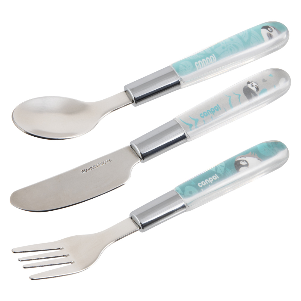 Speciálně tvarovaný dětský příbor (nůž, vidlička, lžička) z kvalitní nerezavějící oceli je určen dětem, které se učí samy jíst. Vhodný pro děti starší 18-ti měsíců.
