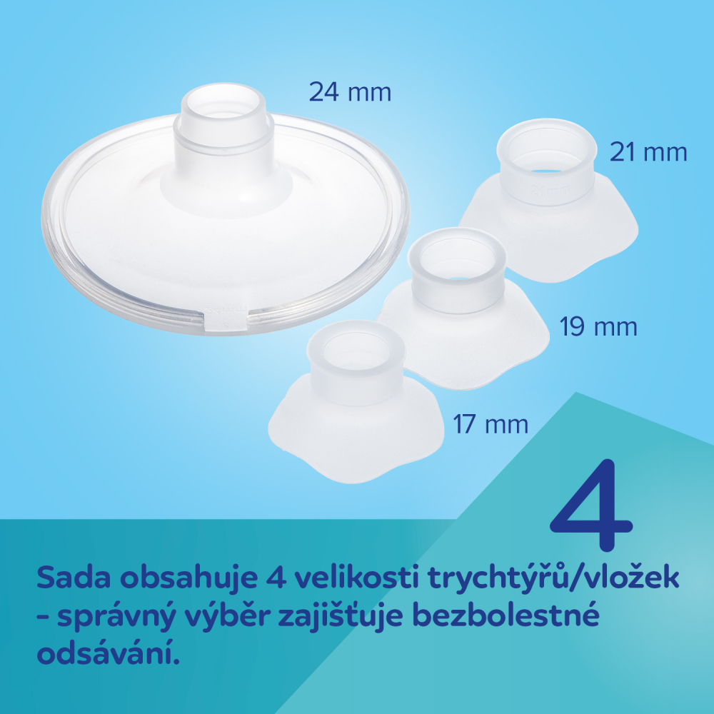4 velikosti trychtýře/vložek (17, 19, 21 a 24 mm) – správná volba velikosti pomáhá dosáhnout optimálního toku mléka.