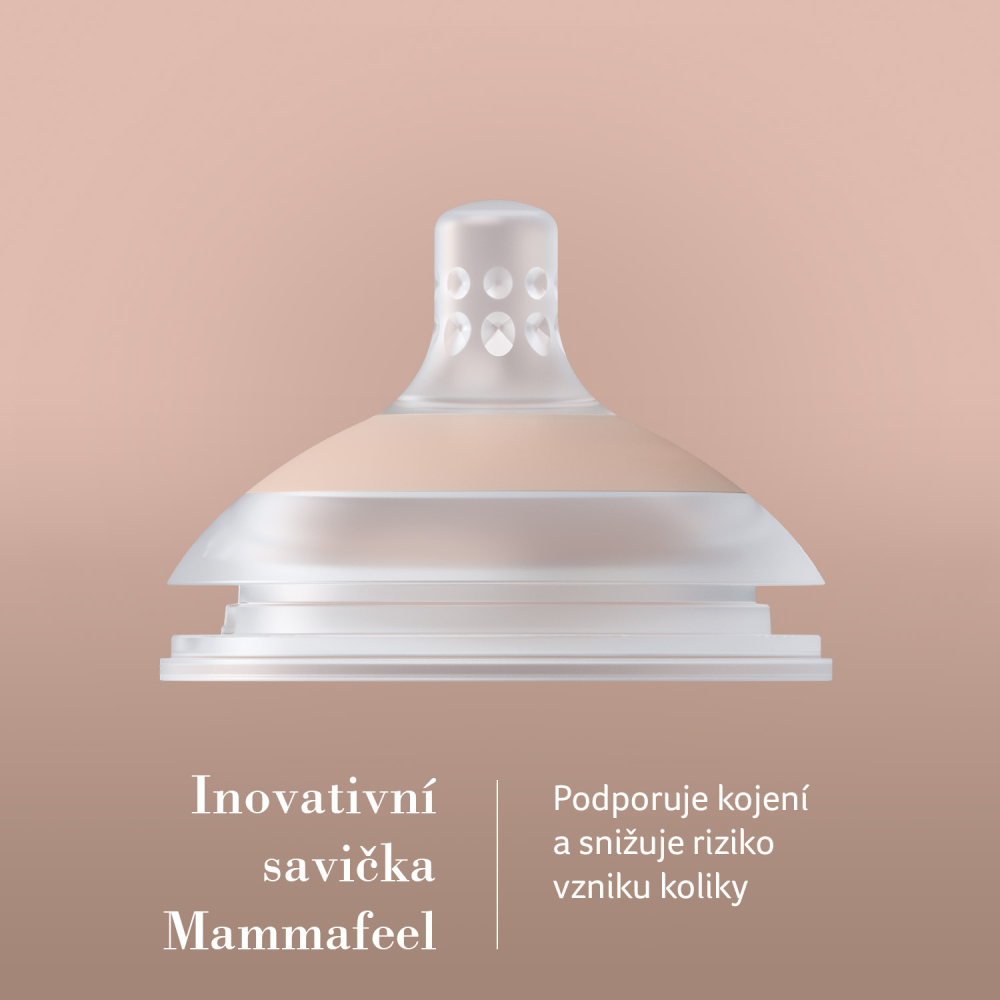 Dynamická savička lahve Mammafeel nejen co nejvíce napodobuje blízkost a přirozené sání z prsu, ale zároveň nenarušuje sací reflex, takže se miminko může volně vracet k sání z prsu maminky.