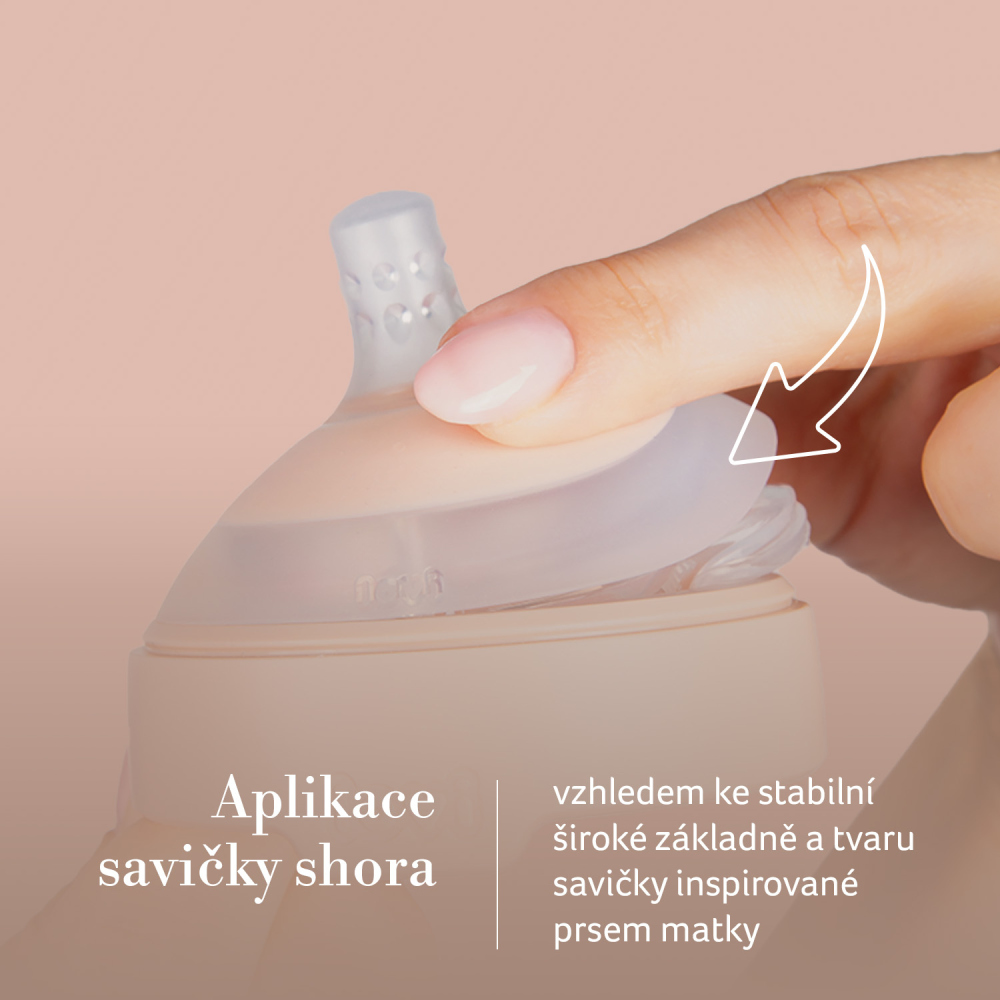 Antikoliková savička - umožňuje umístit rty správně, miminko dýchá volně nosem, což snižuje riziko vzniku koliky