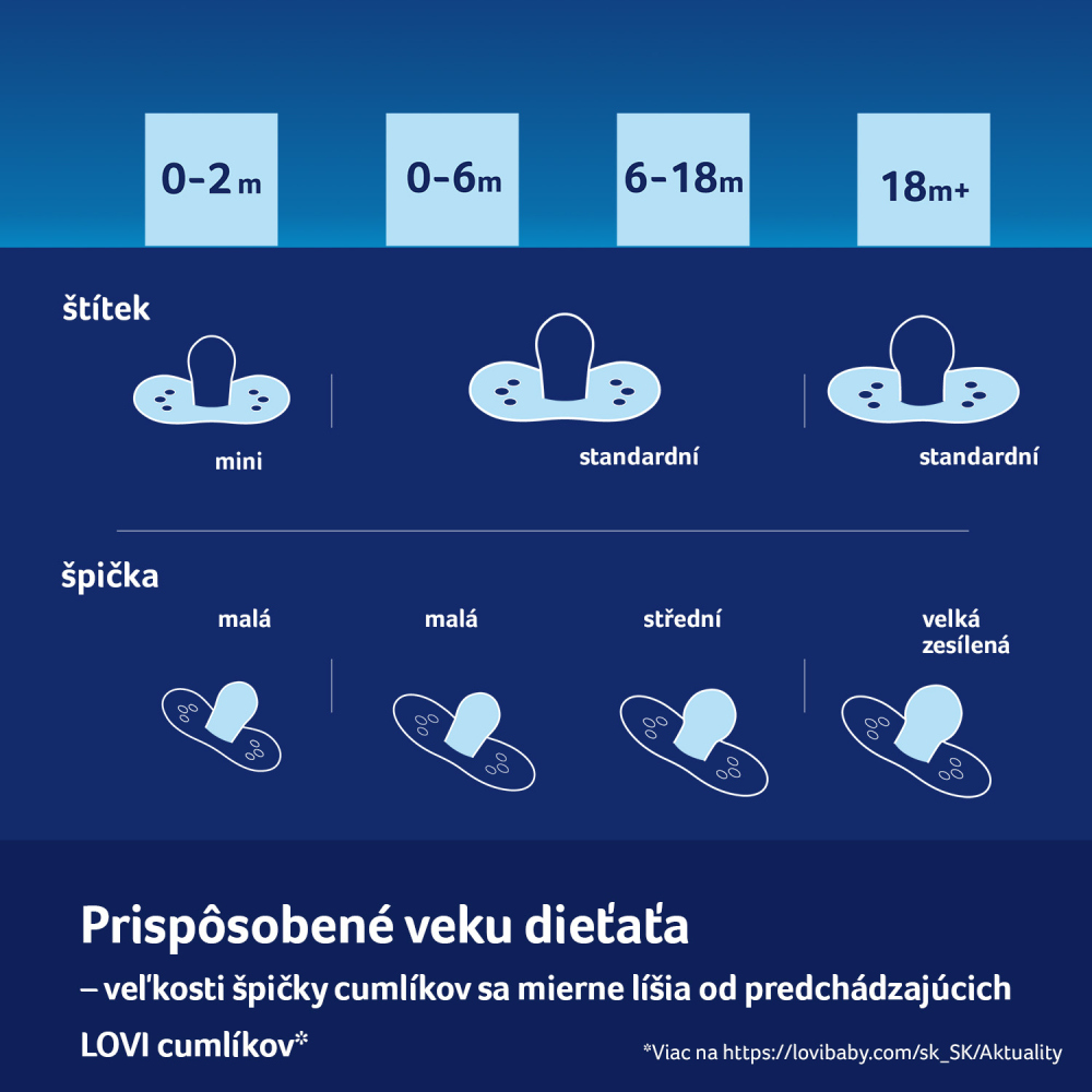 Veľkosť sacej časti je prispôsobená veku a fáze vývoja dieťaťa, líši sa od veľkostí sacích častí u štandardných cumlíkov LOVI.