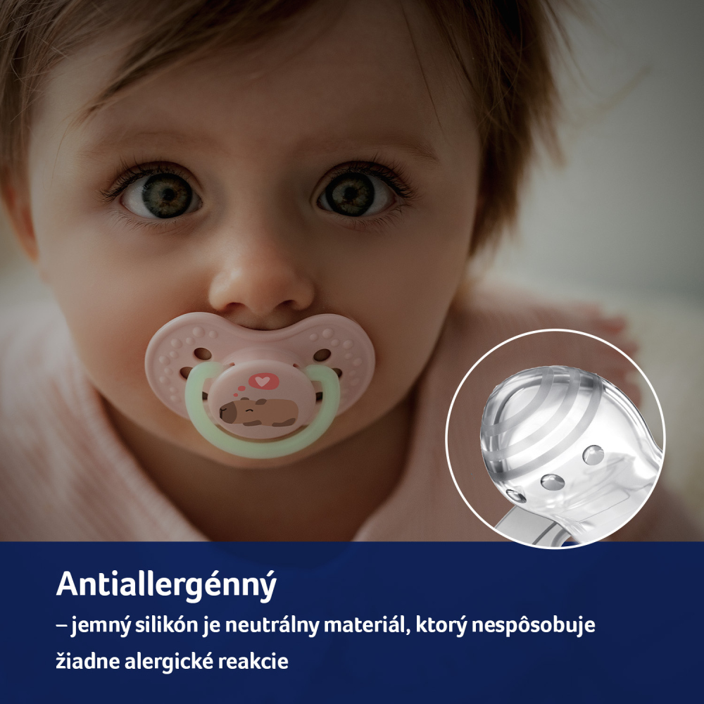 Dynamický cumlík LOVI z kolekcie CAPICHILL je bezpečný pre sací reflex a nenarúša vývoj reči a zhryzu*.
