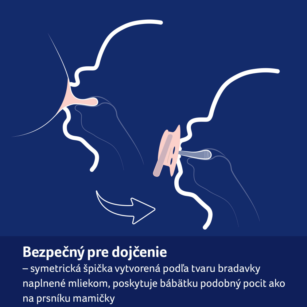 Symetrický tvar špičky vychádza z tvaru bradavky naplnenej mliekom, ktorá poskytuje bábätku známy pocit podobný pocitu z prsníka.