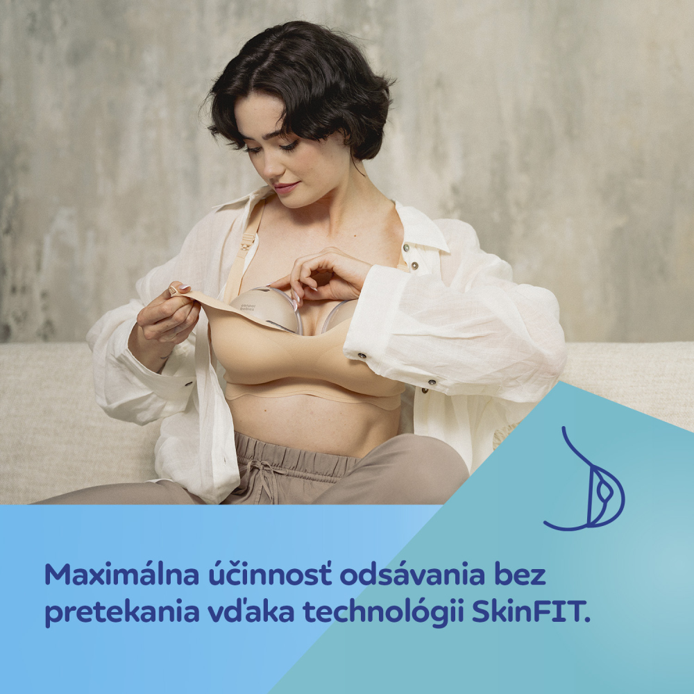 Vďaka technológii SkinFIT zaručuje maximálnu účinnosť odsávania bez bočného úniku mlieka. Technológia SkinFIT je založená na tesnom priľnutí elastického silikónového lievika k prsníku, čo poskytuje prirodzený pocit kontaktu kože na koži, zvyšuje pohodlie a minimalizuje riziko úniku mlieka.